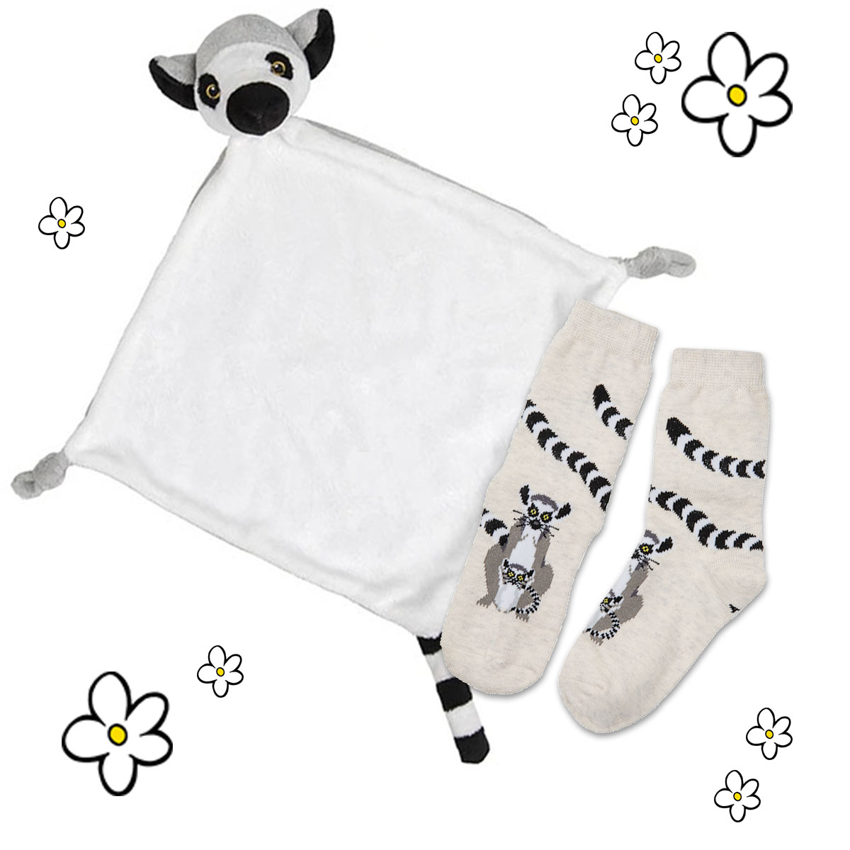 Prachtig setje van een knuffeldoekje en bijpassende sokjes van een ringstaartmaki in zwart-wit-grijs. Zwart-wit is een ideale babyknuffel omdat baby's vooral contrast goed kunnen onderscheiden en nog niet zo goed kleuren kunnen zien. Dit knuffeldoekje zal een kindje goed kunnen zien. De oogjes en het neusje zijn geborduurd, dus geen losse onderdelen. Leuk om zelf te hebben maar ook een geweldig kraamcadeau.