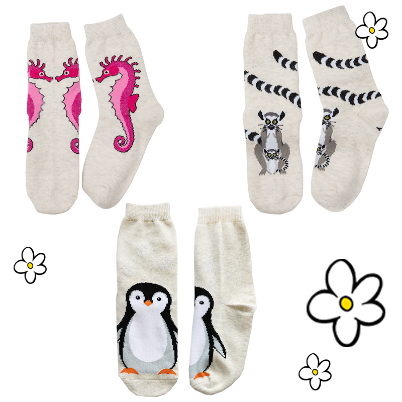 Set van 3 paar leuke kindersokken met dierenprint! De print is ingeweven in de stof en blijft daardoor mooi. Verkrijgbaar in maten van 19 t/m 38.