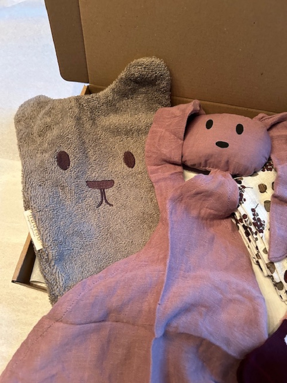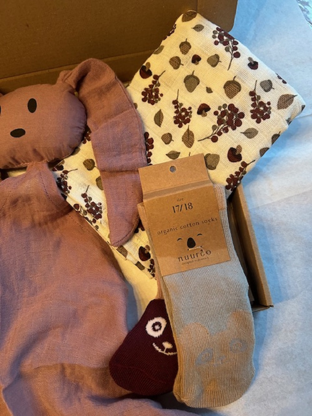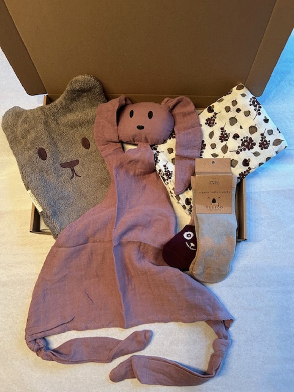Het pakket bevat een washand, hydrofiel doek, sokjes en een knuffeldoekje.